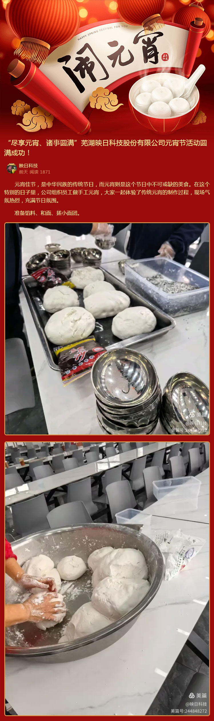 “盡享元宵、諸事圓滿”蕪湖映日科技股份有限公司元宵節(jié)活動(dòng)圓滿成功! 來源: 發(fā)布時(shí)間:2025-02-14 上一條:聚力賦能 共贏未來 | “映日班”開班儀式圓滿舉行 下一條:2024年度蕪湖映日科技股份有限公司“暢游一夏、樂享太平湖”之旅圓滿成功!